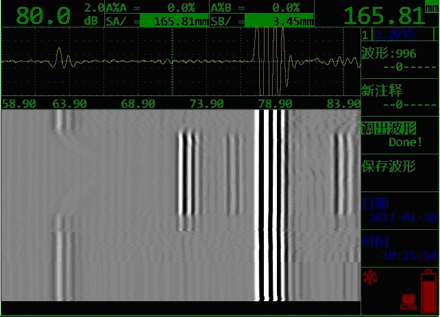 - 支持灰度B掃功能,可顯示截面灰度B掃描,一個(gè)屏幕顯示豐富信息量,可用于簡(jiǎn)單TOFD應(yīng)用。(下圖為灰度B