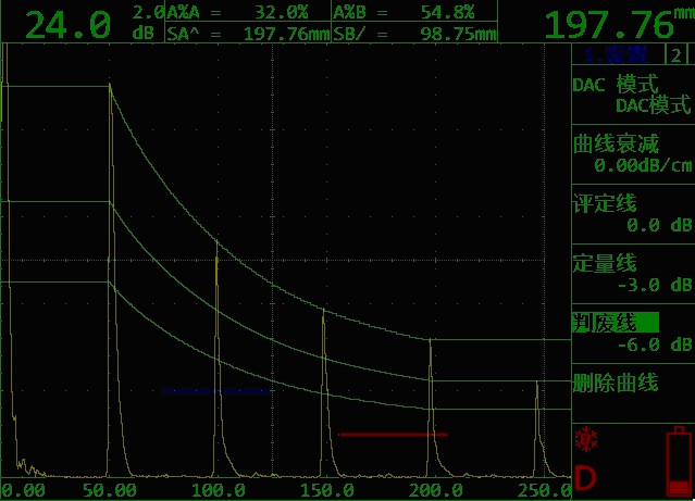 鋼結(jié)構(gòu)焊接規(guī)范焊縫分級(jí)AWS D1.1”評(píng)定標(biāo)準(zhǔn),使檢測(cè)更加得心應(yīng)手,方便現(xiàn)場(chǎng)使用。(下圖為DAC曲線圖)